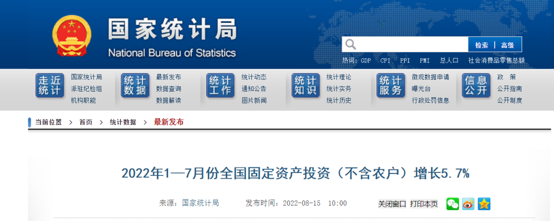 据国家统计局消息,1—7月份,各地区各部门高效统筹疫情防控和经济社会发展,扎实推进稳投资系列举措,加快发行使用地方政府专项债券,适度超前开展基础设施投资,着力推进重大项目建设,盘活存量资产扩大有效投资,全国固定资产投资(不含农户)同比增长5.7%。从环比看,7月份全国固定资产投资(不含农户)增长0.16%。
