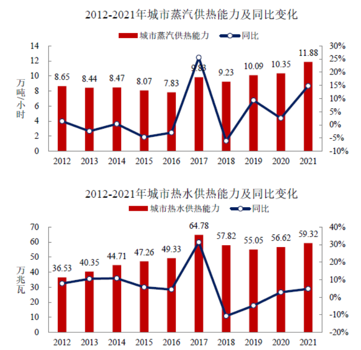 2021 年年末,全国城市蒸汽集中供热能力 11.88 万吨/小时,同比增长 14.80%;热水集中供热能力 59.32 万兆瓦,同比增长 4.78%。